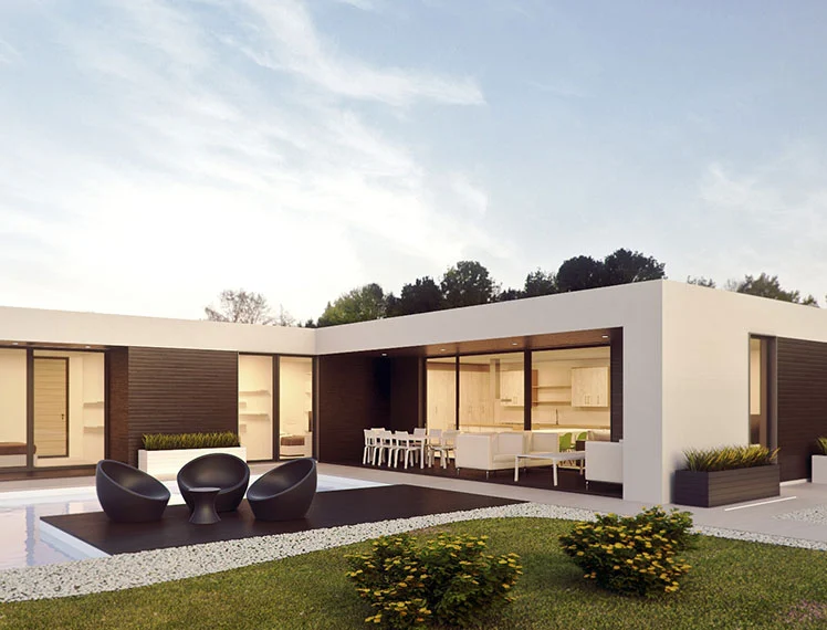 A modern complex of 30 eco-friendly houses along the riverside, featuring shared green spaces and a community boathouse